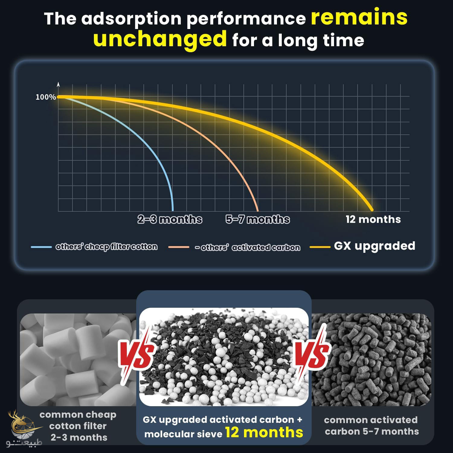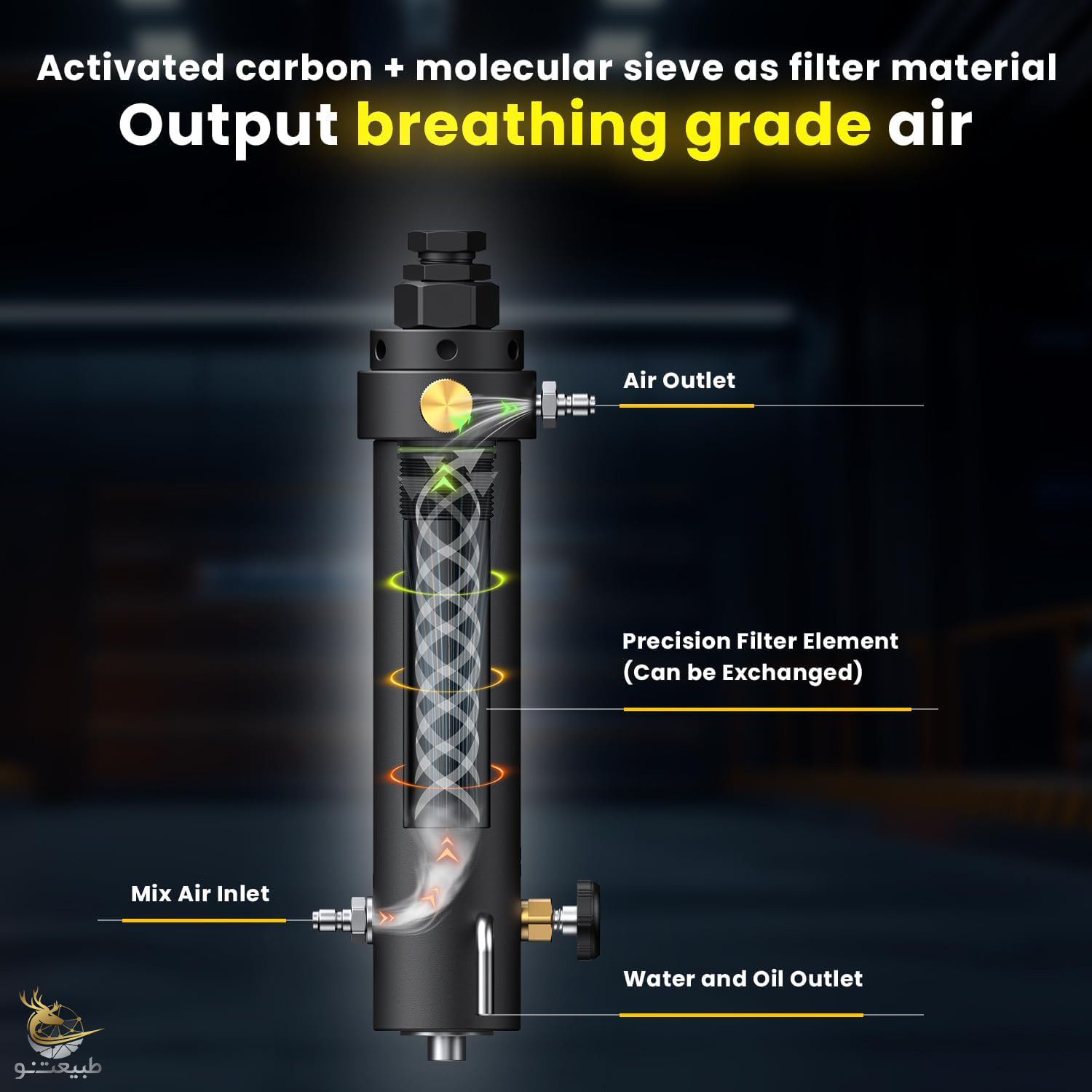 درون فیلتر از دو مرحله فیلتراسیون ترکیبی استفاده شده، کربن فعال + مولکولار سیو (دانههای جاذب)، که ادعا میکند میتواند تا 99٪ روغن، آب و ذرات معلق (حتی ذرات ریز تا حدود 0٫01 میکرون) را از جریان هوا حذف کند، بنابراین هوای خروجی بسیار خشک و پاک خواهد بود، چیزی نزدیک به کیفیت تنفس که برای محافظت از تفنگ ها، تجهیزات غواصی و دیگر دستگاههای حساس حیاتی است.