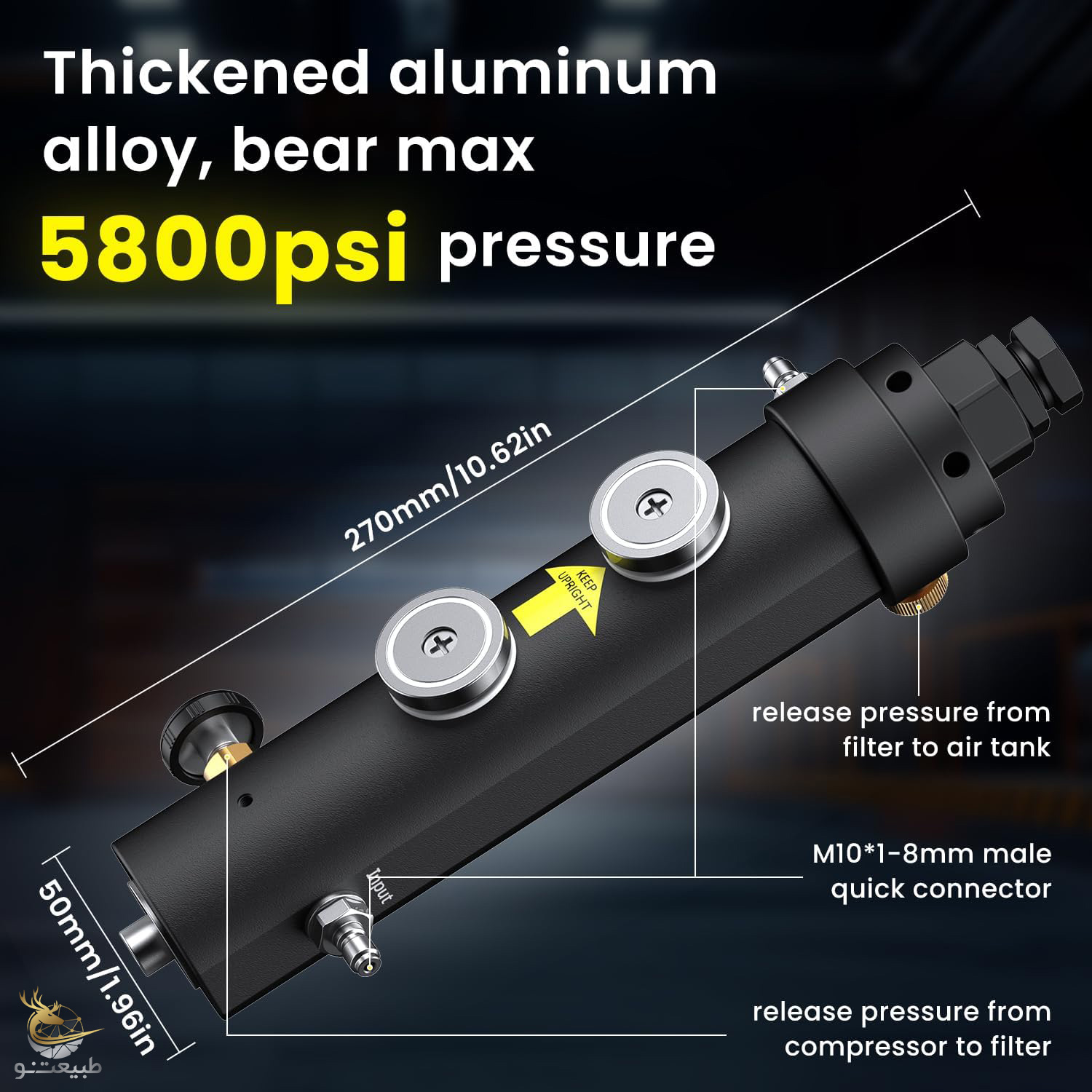 این فیلتر کمپرسور پی سی پی GX یک راه حل حرفه ای برای همه کسانی است که با هوای فشرده فشار بالا سروکار دارند، چه در شارژ تفنگ های پی سی پی ، چه در غواصی یا کاربردهای صنعتی، و با طراحی مستحکم آلومینیومی و سیستم فیلتراسیون چندلایه، قادر است تا فشارهای بالا را تحمل کند و کیفیت هوای خروجی را به حدی برساند که تجهیزات حساس را محافظت کند. بدنه ی فیلتر از آلیاژ آلومینیوم بدون درز با ضخامت واقعی حدود 9.68 میلی متر ساخته شده که در شرایط فشار بالا مقاوم و پایدار باقی میماند.