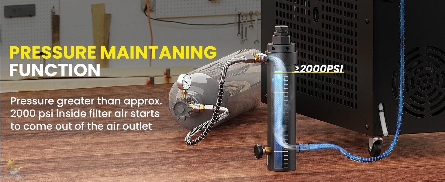 یکی از ویژگیهای هوشمندانهی فیلتر GX ، عملکرد «حفظ فشار» (Pressure Maintaining) است؛ یعنی فیلتر تنها زمانی اجازه میدهد گاز به مخزن برود که فشار به حدود 1800 تا 2000 PSI برسد، که این اقدام باعث افزایش کارایی جداسازی رطوبت و روغن میشود.